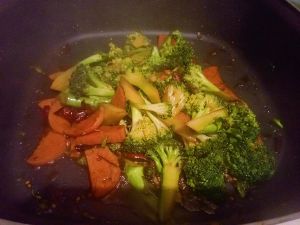 西蓝花倒入后加入酱油、料酒和少许鸡精、食用盐,转大火爆炒至西蓝花上色,试吃入味即可、