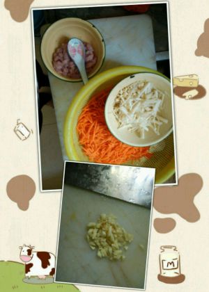 胡萝卜刨或者切成丝,金针菇切去老根后洗净切段,瘦肉切成丝,加地瓜粉和适量盐搅拌,蒜头切成蒜蓉