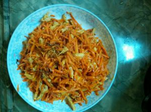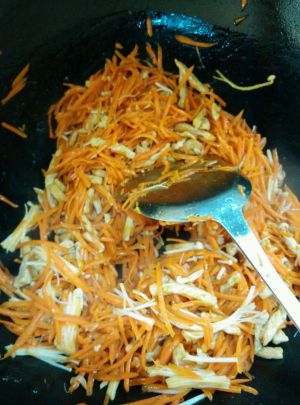 接着倒入炒好的胡萝卜放盐生抽和味满香炒入味。