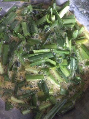 加入适量盐,少许生抽打散,像平时打鸡蛋的手法就可以,让韭菜与鸡蛋充分融合