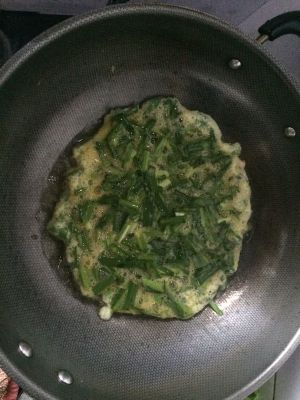 用筷子轻轻搅拌底部已经成型的鸡蛋,向一侧推动,让上层未接触油的鸡蛋和韭菜流动到底部成型