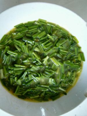 锅内还剩下底油,放一点十三香,出香味之后,放入韭菜,马上撒上盐和鸡粉!不需要放味精,因为味精会破坏鸡蛋的营养成分!