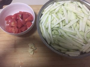 然后放少量油,放入蒜,洋葱,辣椒。待辣椒熟了之后放入西红柿。等西红柿炒成汁了再放入茄子。
