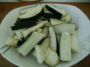 茄子用手掰开一小块一小块就可以,用刀切也可以(滚刀切)但很容易变黑,(由于茄子很容易氧化所以弄好茄子后要赶紧吵啦)