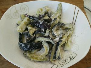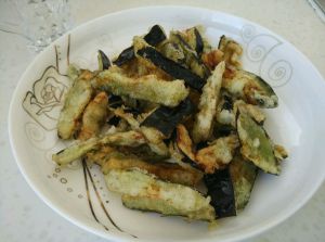 把面糊到茄子上搅拌,每个茄子上都粘上糊糊,起锅烧油,中火五分热,夹一个茄子试试油温,泡泡沸腾的大就下茄子