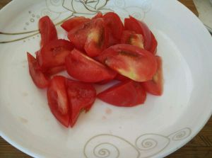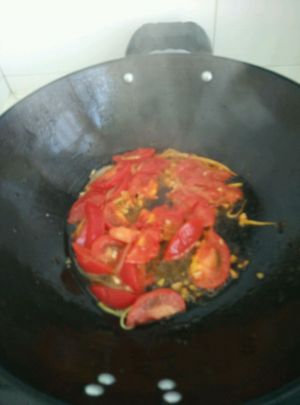 锅内倒一点油(食材已经炸过,油份多,不用放太多),放葱蒜爆香,下西红柿炒出红汁。