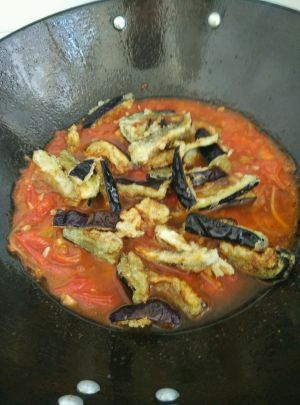 倒入炸好的土豆和茄子翻炒。倒点水,继续翻炒一下。