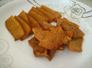 起锅烧七成热,炸茄子成金黄色,捞出锅。
