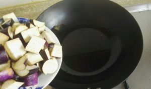 往锅中加适量食用油,至7成热,加入茄子爆炒