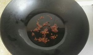 锅中放比平时炒菜1.5倍的油,油三四成热时,放入花椒小火炸,花椒炸黄捞出。