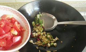 锅内只留少许油,大火烧热后,放入葱姜蒜辣椒煸炒,炒出香味。