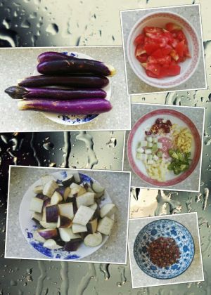 食材准备:长茄子洗净,从中间顺刨为二,切成3-4厘米的段;西红柿切成小块;葱、姜、蒜、干辣椒切碎,绿辣椒切成圈。