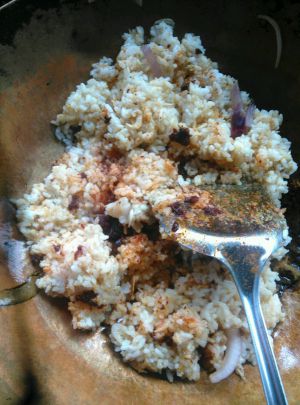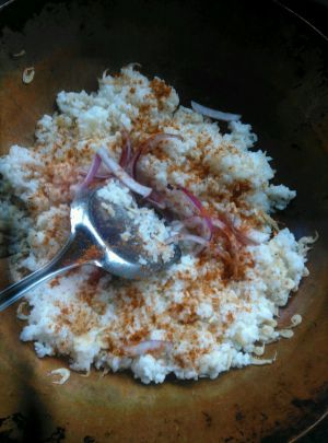 放少许洋葱丝,8g咖喱粉均匀撒在米饭上,翻炒1分钟。