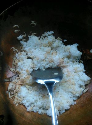放少许花生油入锅,中火,将虾米放入锅中炒1分钟,倒入米饭,翻炒。