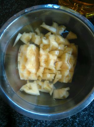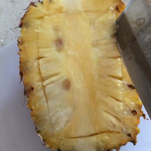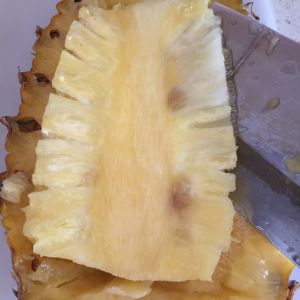 成熟 菠萝一个 用清水 清洗外表 将菠萝居中 一分为二 用勺子 先取出菠萝软肉部分 在取出 中心硬肉部分 切中丁 备用