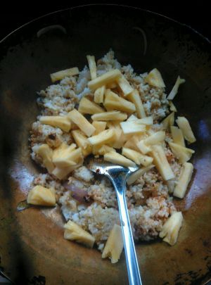 米饭熟后就可下锅炒各种配料啦(菠萝最后加入拌一会就行)