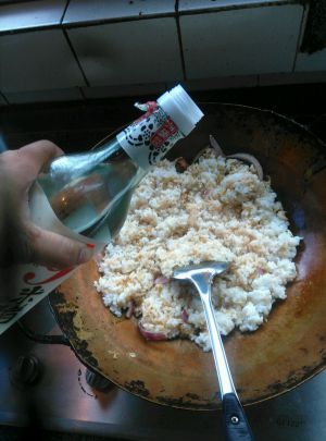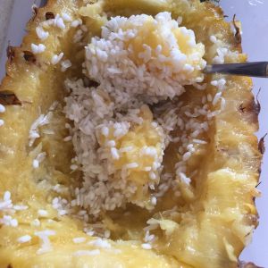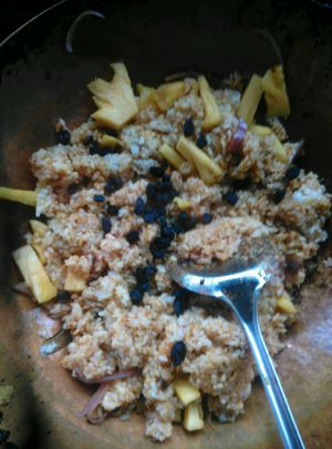 大火 加入 事先准备好的 菠萝 以及菠萝汁 翻炒均匀 加入 新鲜出炉的热米饭 佐料有 盐 鸡精 黑胡椒粉 咖喱 白砂糖 纯牛奶 (适量若干)中小火 翻炒至 洋葱柔软 即可出锅