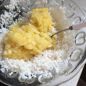 锅内下油,放入打散的鸡蛋翻炒,成形后放入胡萝卜,青豆翻炒。再放入米饭翻炒,最后加入菠萝稍微炒一下便可出锅。