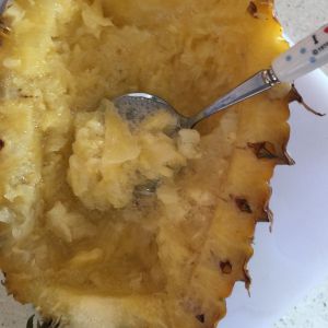 将大块菠萝肉挖出后剩下的用勺子在挖下。记住里面的菠萝汁不要扔掉哈。一会放入米饭里。