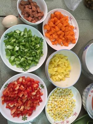 1、将所有准备的材料切成丁备用 2、将所有准备的材料分开下锅翻炒六七分熟后混在一起拌匀后捞起备用(鸡蛋、火腿跟菠萝不用炒) 3、炒饭,米粒分开后打入鸡蛋翻炒,待蛋液包裹完米饭后的将翻炒的材料(青红椒,玉米,胡萝卜等)倒入翻炒 4、先后倒入火腿跟菠萝,加少许盐跟酱油调味翻炒几分钟即可出锅 5、将炒好的菠萝饭装入菠萝内,味道更香