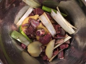把羊肉切成丁状或片状 用料酒腌制十分钟去膻味。