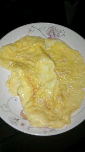 锅中热油(平时一道菜油量的一半),倒入蛋液(蛋液中加一丢丢盐),凝固即可捞出