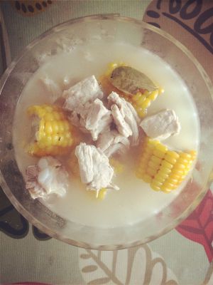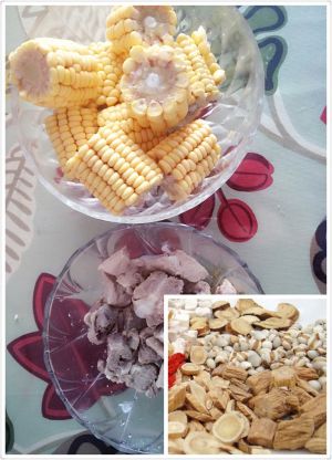 three^_^ 先将玉米放入锅中,在放入排骨,接着放入配料,大火煮开。换小火慢炖。出锅前撒上盐调味即可。