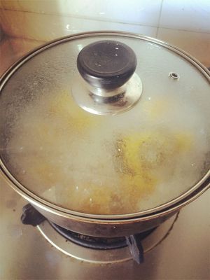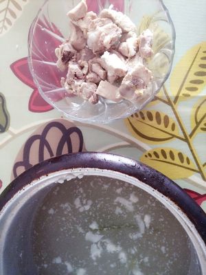 放高压锅里面!用焯排骨去浮沫的水。不够的话继续加。我用的普通高压锅,电高压锅的话没有这个弄出来好喝!大火喷15分钟。等放气,小火煮20分钟~可以放点香菇。这次我放的冬瓜~