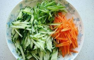 香菜切段,青椒、胡萝卜、黄瓜切丝。把香菜、青椒、胡萝卜、黄瓜放入盆中。