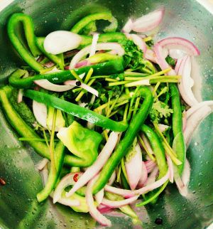 把大葱和洋葱切细条。香菜切5厘米长、紫苏辣椒蒜米切沫。