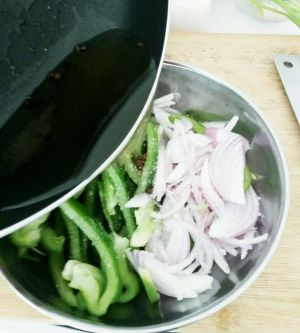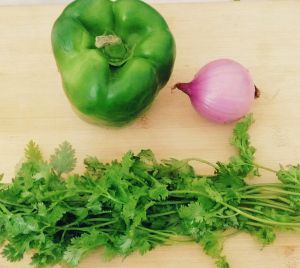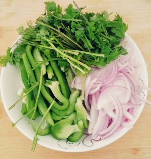 青椒,洋葱切丝。香菜切段。