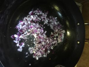 【2】放香料 加入红葱头,待部分红葱头开始变焦后,倒入葱末,一起翻炒,炒出香味后再放蒜头末。(当有红葱头和蒜一起出现时,蒜一定最后放,因为蒜焦了之后会变苦。)