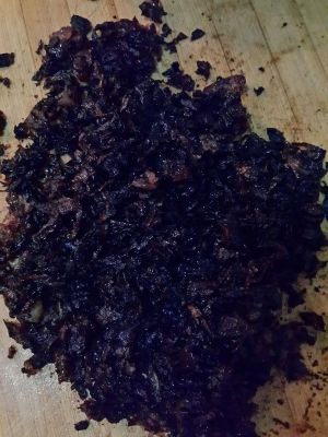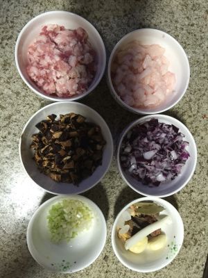 先把干香菇放在冷水里浸泡(软了就行),再把姜蒜洋葱和泡好的香菇剁碎(香菇根不要)放一旁,五花肉也切成小颗粒状(好看又好吃)