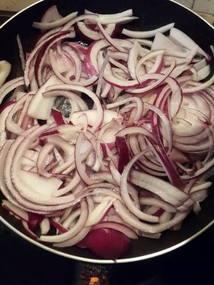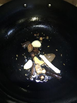 我直接在砂锅里炒的:少许油热锅(五花肉会出油),放五花肉炒颜色发白,多炒一会,逼出油,放香菇,葱姜蒜,还有洋葱酥,料酒适量,老抽适量,生抽适量,炒3分钟,倒入热水,没过肉就可以了(不要用冷水,肉会紧不好吃)放冰糖和八角,这些步奏几乎是同时的!
