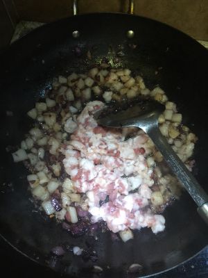 预热锅子,放适量油,微热后先放姜蒜,爆完再放洋葱香菇碎末一起炒,香味出来后就放小肉粒,炒至肉色变白