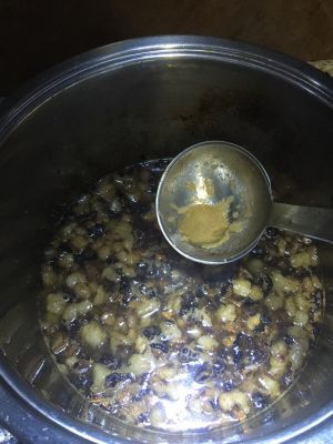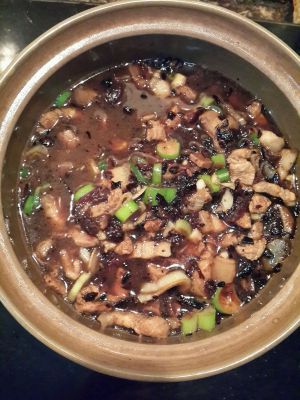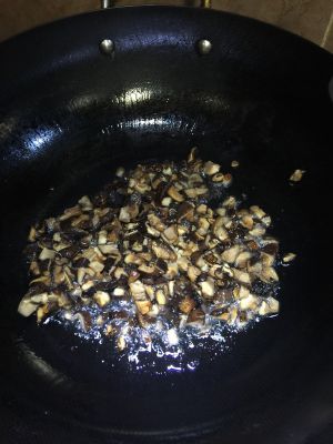 炒好后倒入炖锅,加入发香菇的汤,生抽、老抽、盐,稍淡味些