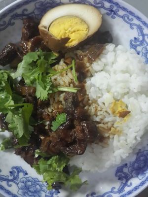 米饭好了,浇上卤肉吧还有鸡蛋(配青菜也可以,家里没有就用香菜了