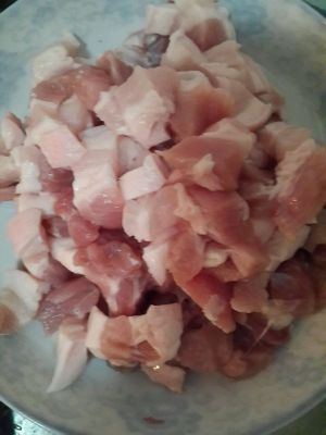 五花肉肥肉瘦肉分开切丁,水发干香菇挤干水分,切粒留汤。