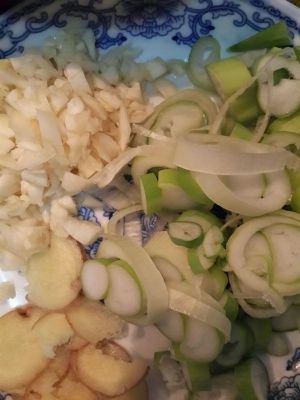焯水的同时将葱切段、姜切片、蒜拍碎
