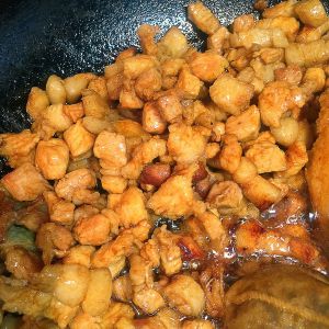 然后放米酒酱油膏继续炒然后加水没过肉丁