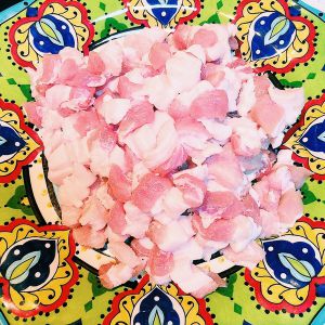 五花肉放凉后切成1cm左右的小条,最好是一条里有皮有肥又有瘦。然后再把香菇切成丁