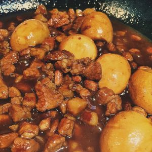 水沸腾后转入砂锅,放入水煮蛋,加盖小火慢煮一两个小时,至五花肉软烂。期间可以时不时翻动,避免黏锅。如果发现收汁太快,可以适当加一点开水。最好是煮到最后还有一些卤汁剩余为宜,卤汁浇到饭上,清香的米饭吸收了浓郁的卤汁真的很过瘾
