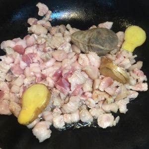 5、把切好的五花肉和葱姜蒜一起放进Harthsun麦饭石炒锅中煸炒,直至微焦出油