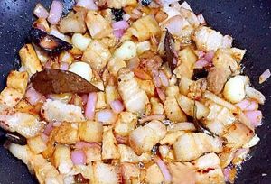 用锅内剩余的油放入五花肉翻炒至白肉略发黄,这样可以去掉多余油脂,做出来的卤肉不腻