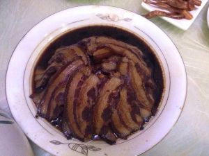卤好后切片铺盘底梅菜铺在肉上面上锅大火蒸5分钟后把盘子倒扣在另外一个盘子上,摆盘修饰下即完成了!