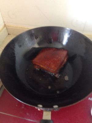 把肉捞上来冷却,再把老抽把肉块涂抹起来。然后锅里放菜籽油,把肉块放油里炸一下。