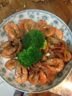 开锅盖,倒入蒸鱼豉油适量,生抽一丁点,白糖适量,炒到酱汁发稠,均匀包裹在每只虾身上后就可以关火了。