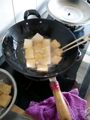 锅内放油,油热下油豆腐,炸5.6分钟捞出。