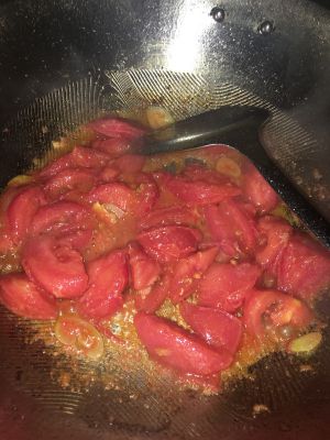 加适量油热锅,下葱姜、西红柿,煸炒至皮卷起,炒出番茄汁(个人不喜欢加买来的番茄酱),加老抽 、翻炒数下。