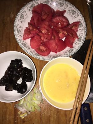 鸡蛋瞬时针打散备用,木耳去蒂根切小块,葱姜切好备用。